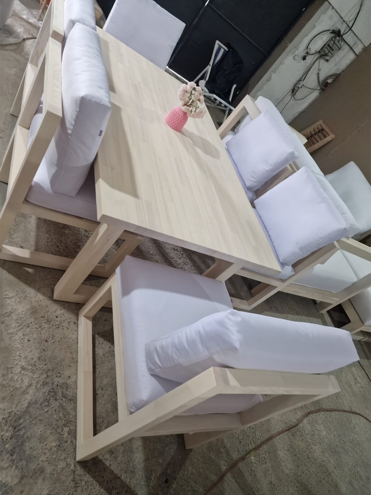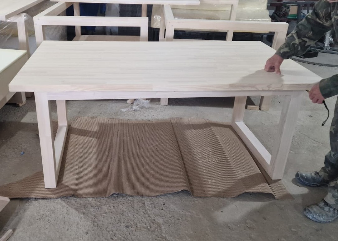 Masa este realizată cu placă din lemn masiv, cu grosime de 40 mm.